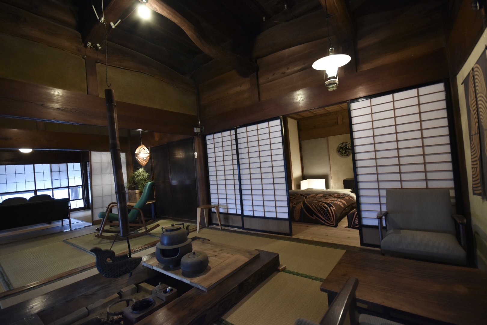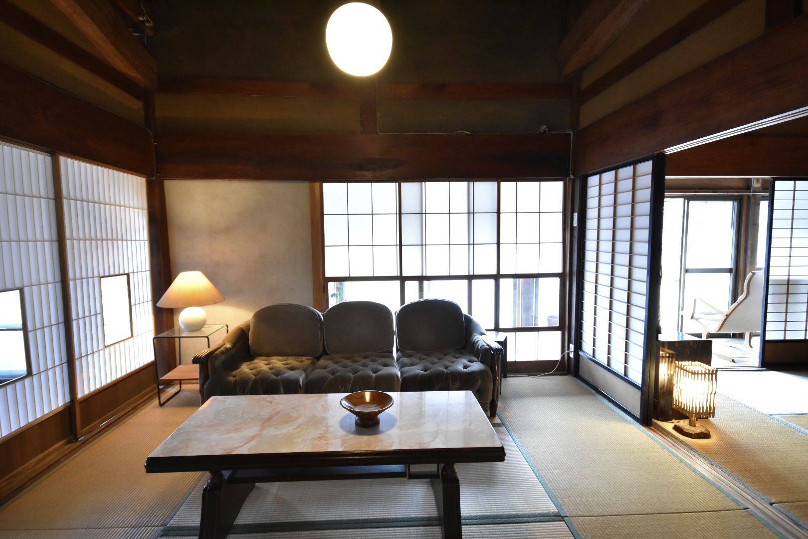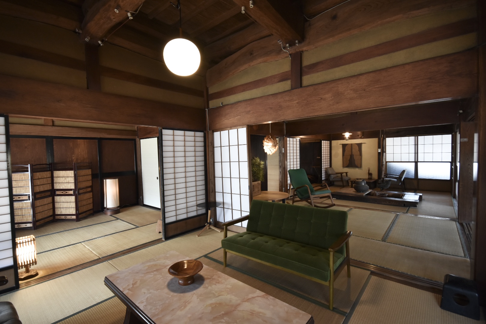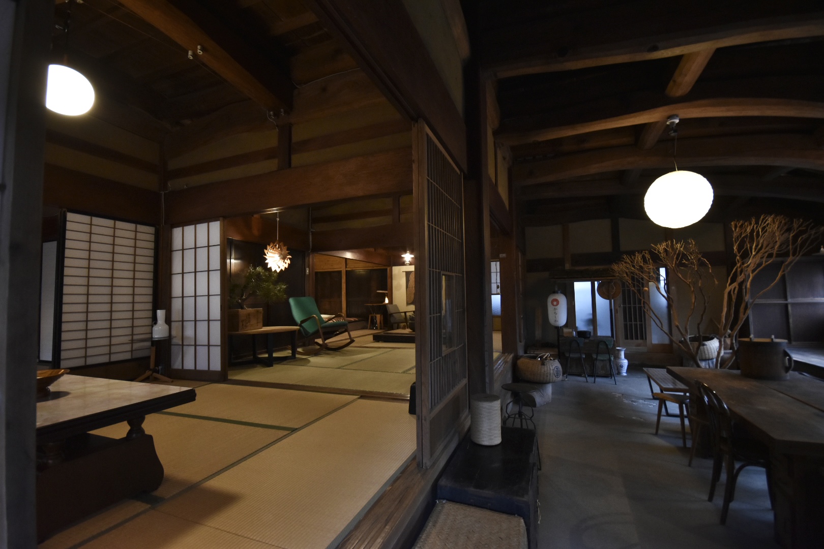 -Opening the door reveals a stunning earthen floor, with various serene tatami rooms beyond-