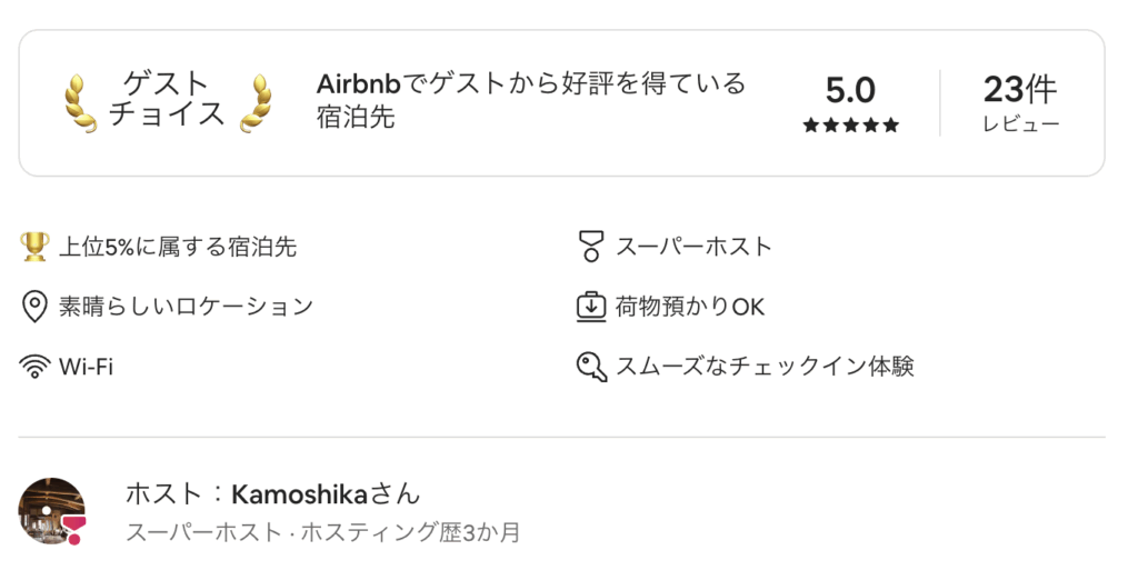2025年8月現在、Airbnbにて「スーパーホスト」に認定され、さらに「ゴールドゲストチョイス」を受賞しております。レビューに関しましては、Airbnb内にてご確認下さい。